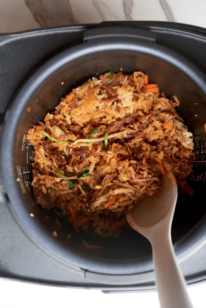 As the rice and meat near completion, you can layer vegetables on top, such as spinach, carrots, bean sprouts, mushrooms, and zucchini, allowing them to steam together with the rice (depending on the vegetable, it may be cooked from the beginning). Some rice cookers even have a sauté or “crispy rice” function that mimics the crunchy base typically achieved in a stone pot.