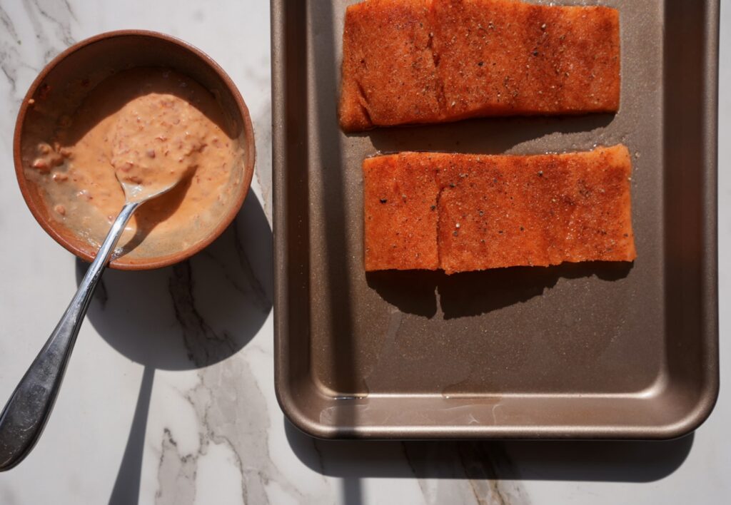 4. Place the seasoned salmon on the prepared baking sheet. Spread a small spoonful of the bang bang sauce over the top of each piece.