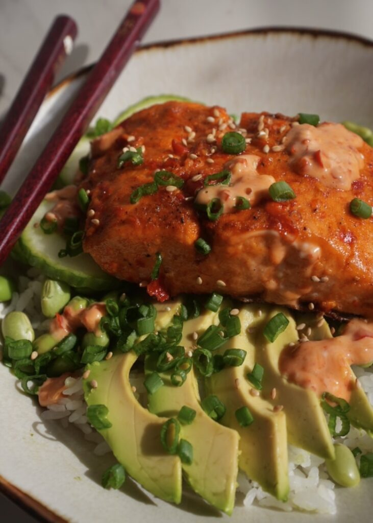 Baked crispy salmon with bang bang sauce is a flavorful, golden salmon dish topped with a creamy, sweet-spicy sauce – perfectly paired with rice and fresh veggies.