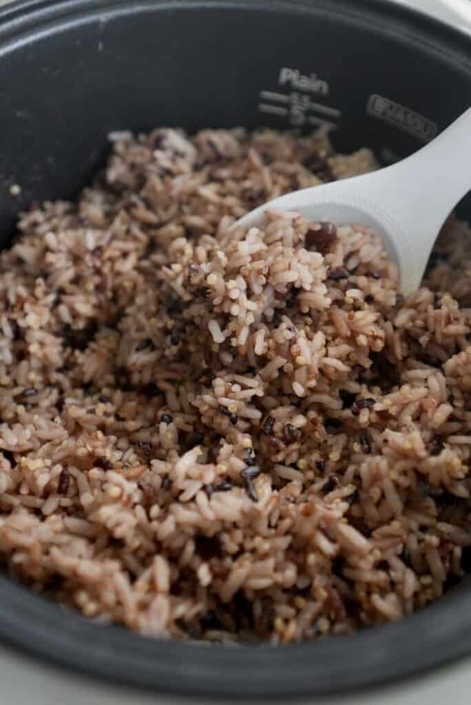 In this recipe, white rice is combined with quinoa, black rice, mochi mugi (Japanese barley), and adzuki beans. But you can totally customize this to your liking! Each brings something different to the table:
