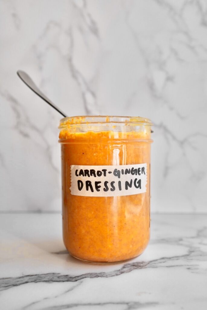 This carrot-ginger dressing is bright and savory-sweet, with fresh carrot and ginger bite and gentle umami from white miso, balanced by tangy rice vinegar.