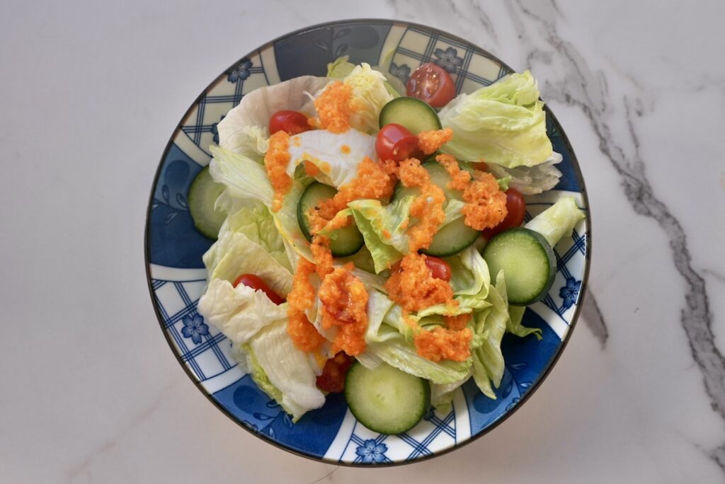 Often served over a simple bed of iceberg lettuce, this dressing balances the natural sweetness of carrots with the sharp warmth of fresh ginger, rounded out by onion, rice vinegar, and a neutral oil. Its texture is slightly creamy yet light, coating vegetables evenly rather than weighing them down.