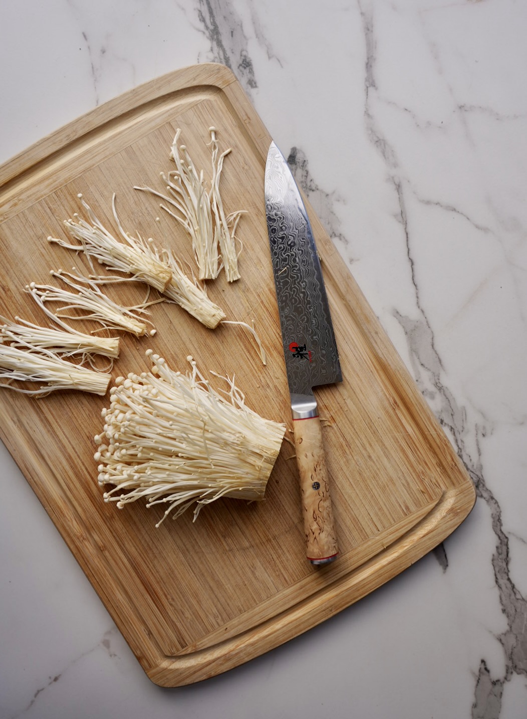 - Trim the roots off the enoki mushrooms and separate them into small clusters (about 1/2 inch wide).