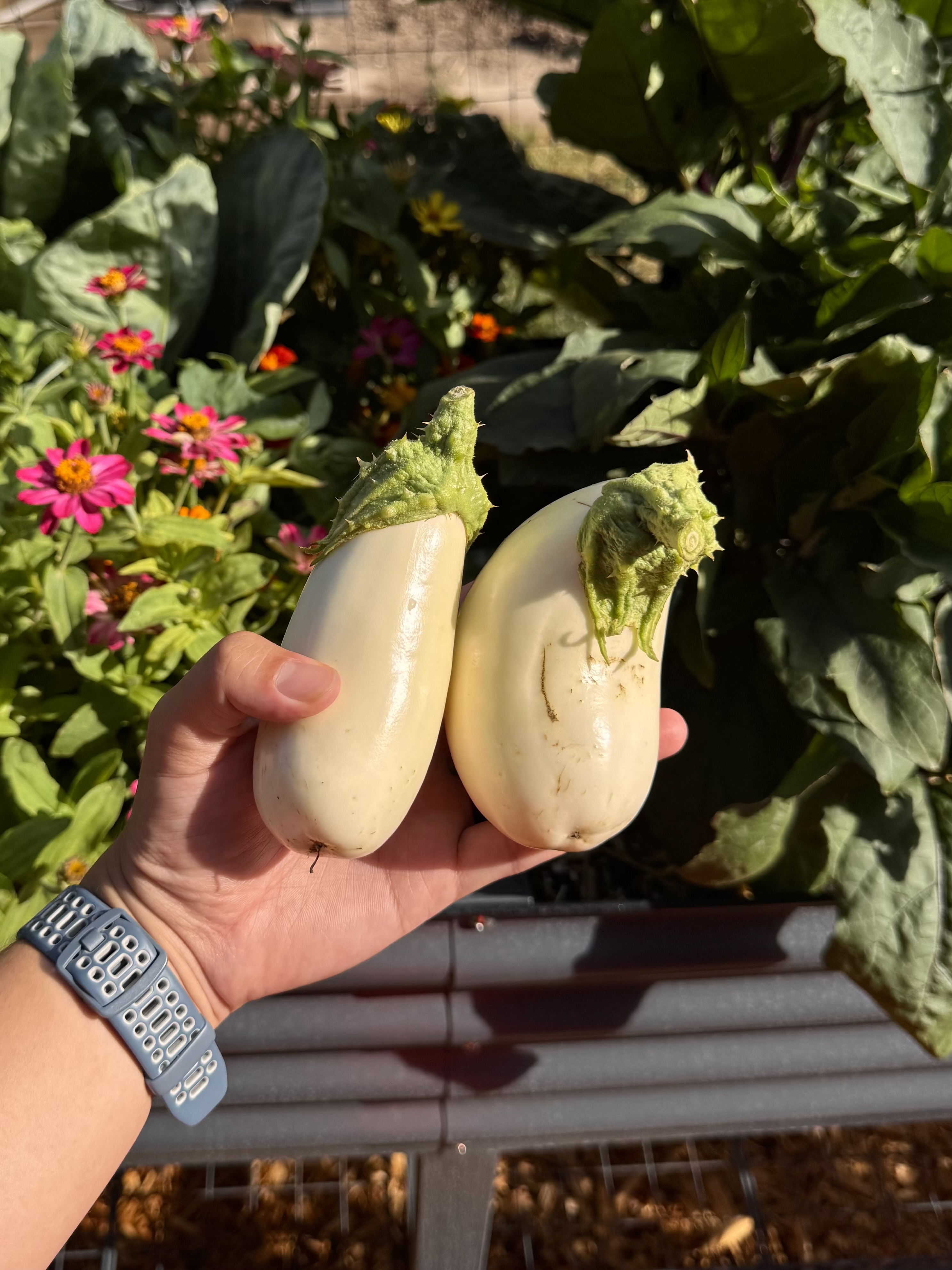 Jeff had grown some beautiful white eggplants for her, and we wanted to find a good way to use them. We all ended up loving how the eggplant transformed the dish – soaking up the savory, umami-rich sauce and becoming melt-in-your-mouth tender while still holding its shape.