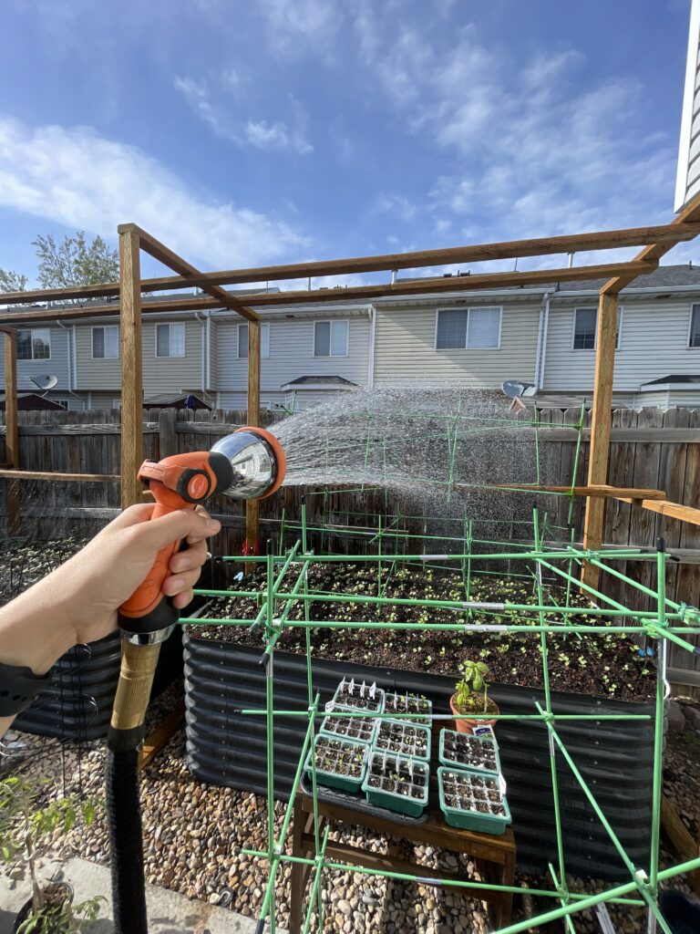 Organic Liquid Fertilizer: Additional nutrition for your plants will help them grow. Organic liquid fertilizer is quickly bioavailable for plants (more of a quick-release method), but is also not potent enough to harm your plants. You can mix it in a bucket or sprayer and then apply it to the base of the plant. Adding nutrition to your soil after the initial amendment will also help to your soil stay strong for a longer period. I usually apply liquid fertilizer every two weeks to month, depending on how big my plants are.