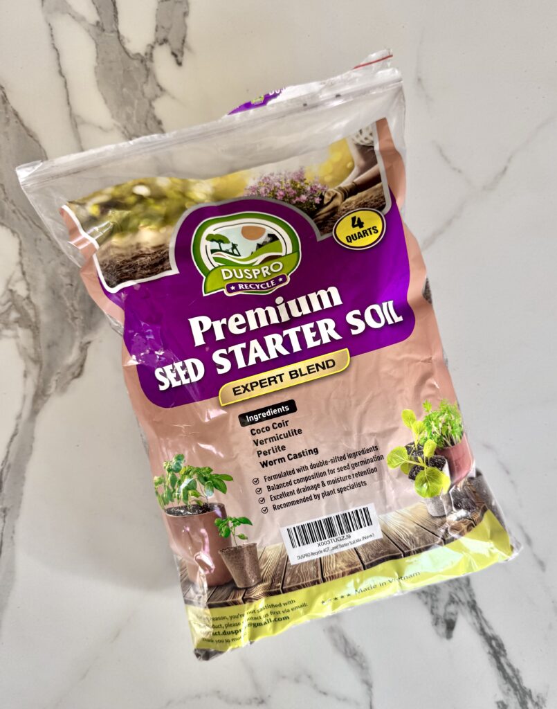 Seed Starting Mix: I usually buy my seed starting mix at Home Depot, but this one on Amazon is a solid option. You will want a seed starting mix (not a potting mix!–common mistake), because it won’t contain twigs or rocks that can prevent seeds from spouting.