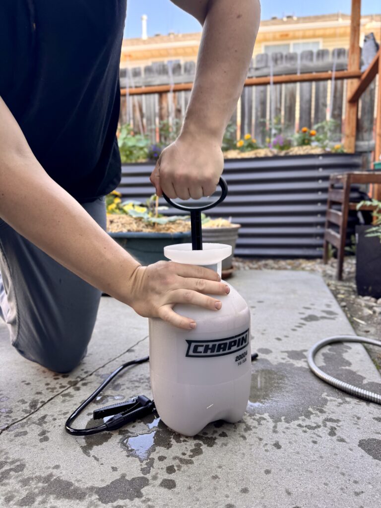 Garden Sprayer: If you do go the organic liquid fertilizer route, it is very nice to have a dedicated sprayer to mix up the fertilizer and apply it to your plants. Below you can see me putting liquid fertilizer into my sprayer. A sprayer is good to have for liquid fertilizer because it applies nutrients evenly and efficiently, helping prevent over-application and ensuring plants get consistent coverage.