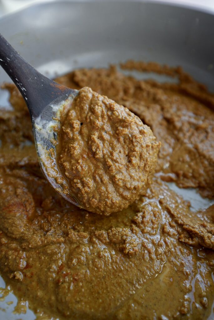 Once the spices have mixed in, your roux will look like this. Keep stirring until it is more cohesive and smooth.