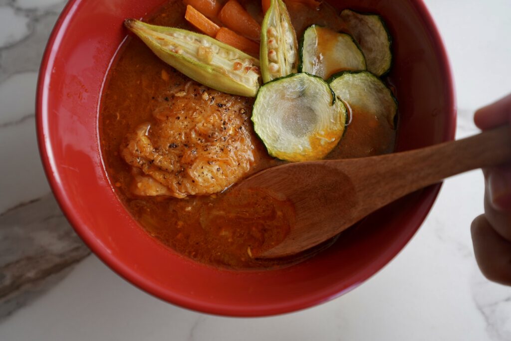 It’s deeply aromatic, spiced, and comforting, often made with a flavorful curry-based broth and topped with seared or grilled meat and a colorful assortment of vegetables.