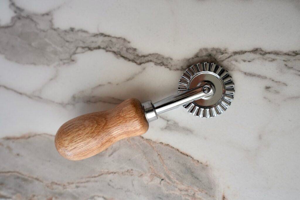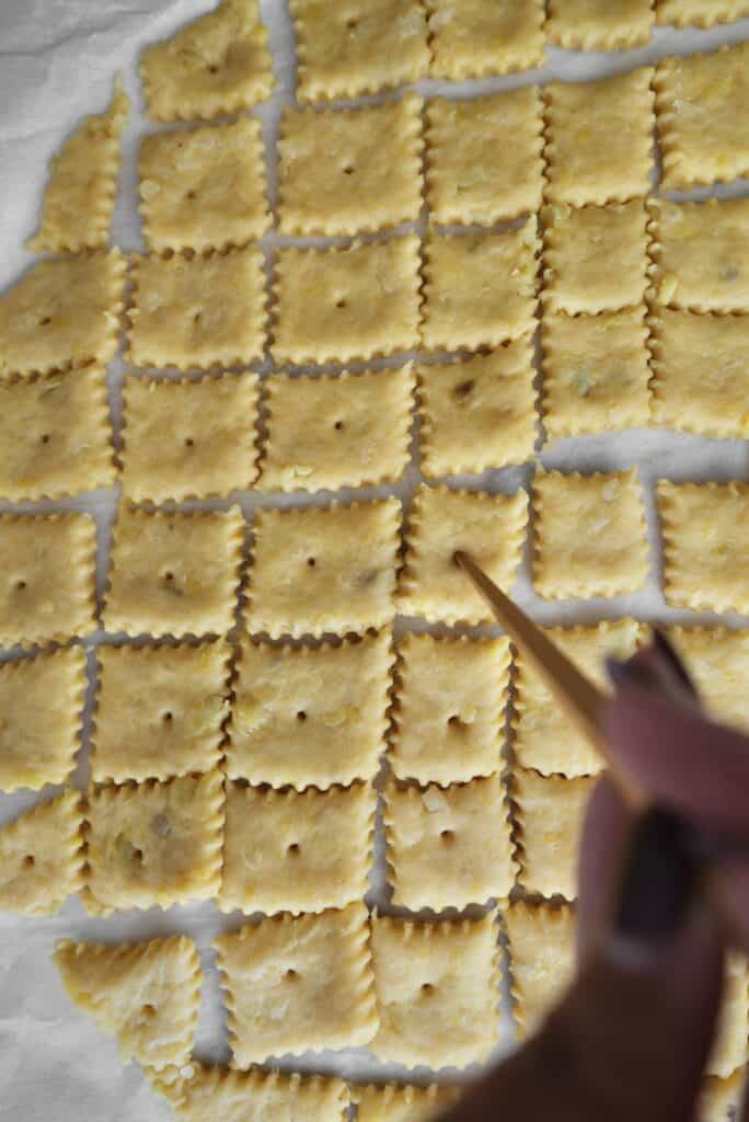 - Roll the dough out on a lightly floured surface until thin (about ⅛ inch). Cut into desired shapes and transfer to a baking sheet. Poke a hole in each cracker with a fork or chopstick to release steam.
