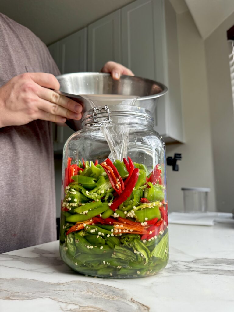 - Dissolve 2-3% salt in filtered water and pour over the peppers until fully submerged.