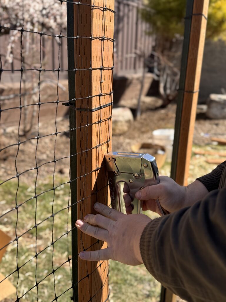 - Stretch your fencing material tightly across the T-Posts. Using about five zip ties per post, secure the netting from top to bottom. Leave a gap where your door will be (you will attach deer netting there later).
