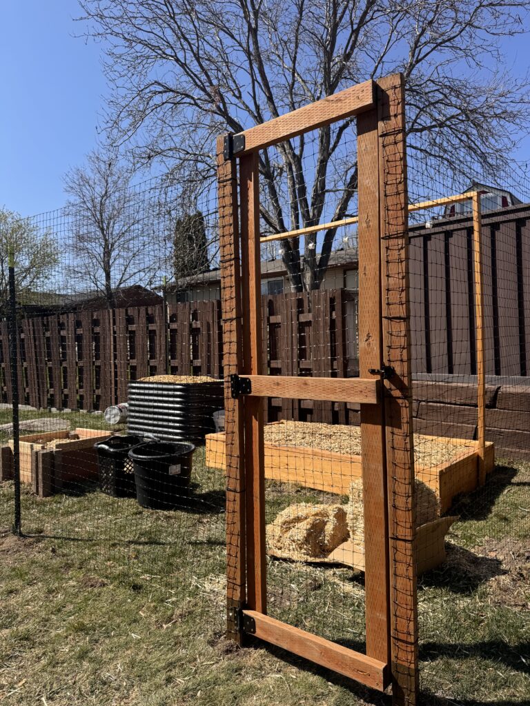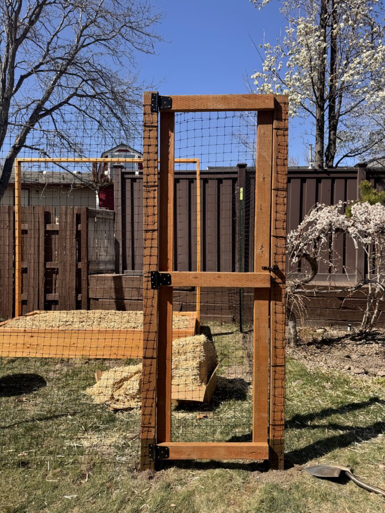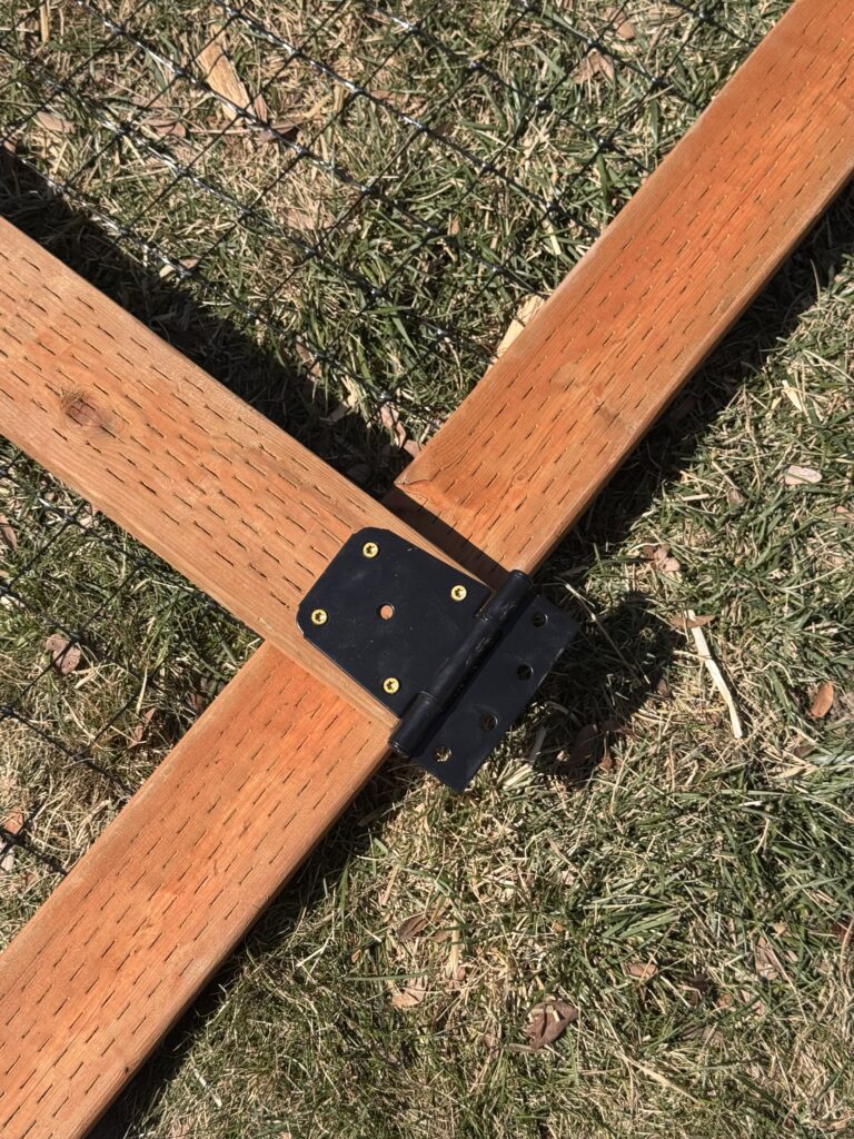 - Add a latch to the opposite side so the door can close securely (my latch was right on top of the middle cross-beam, pictured).
