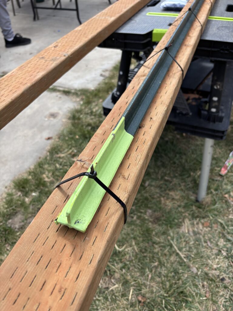 - Attach two of your 8 – 10 ft. 2 x 4’s parallel to the two T-posts where you want your door to go using zip ties. Make sure it’s attached on the T-posts’ flat side.