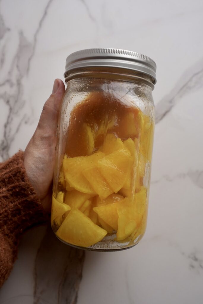 - After about 12 hours, shake or stir once to redistribute the seasoning. Refrigerate another 12 hours, then it’s ready to eat.