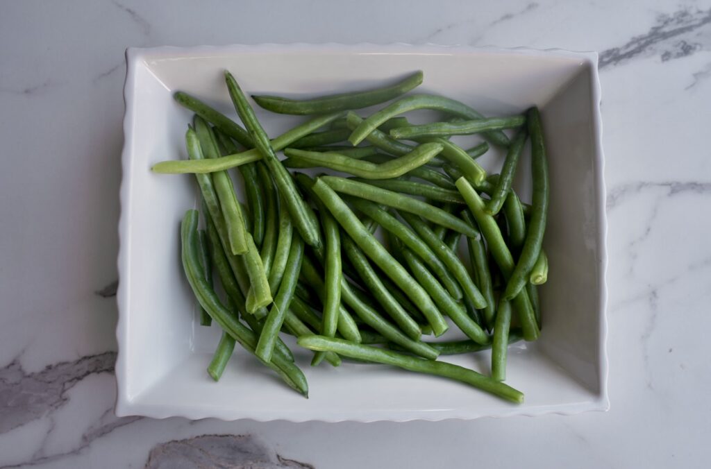 - Place the green beans in a large dish, then set the salmon on top. Reserve 1/4 cup of the marinade for finishing, and pour the rest of the marinade over everything, tossing gently to coat.