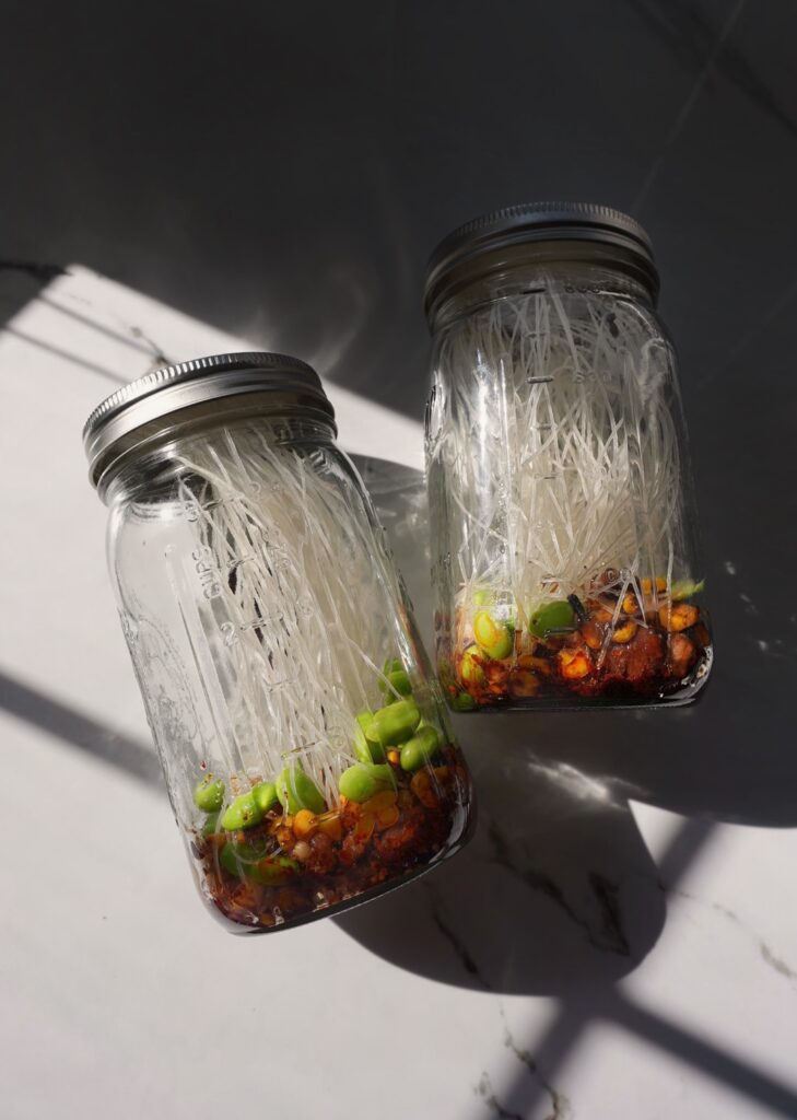 Shoyu Chicken with Spicy Vermicelli Noodles in a Jar features soy sauce-caramelized corn, edamame, and tender chicken cooked in soy sauce, with a spicy kick from gochugaru.