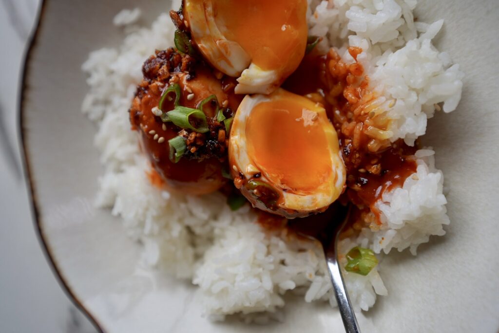 - Serve the spicy gochujang eggs over rice and garnish with chili crisp, green onions, and roasted sesame seeds if desired.
