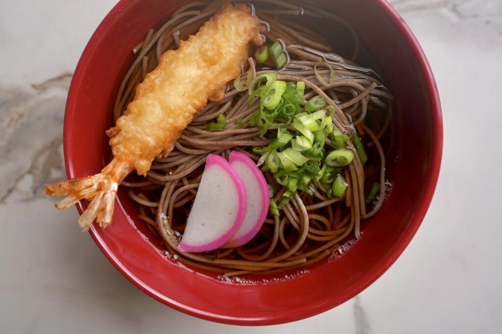 4. Divide the noodles between serving bowls and pour the hot broth over the top. Finish with shrimp tempura, kamaboko, and green onions as desired. Serve immediately, traditionally enjoyed at the end of the year to welcome the new one.