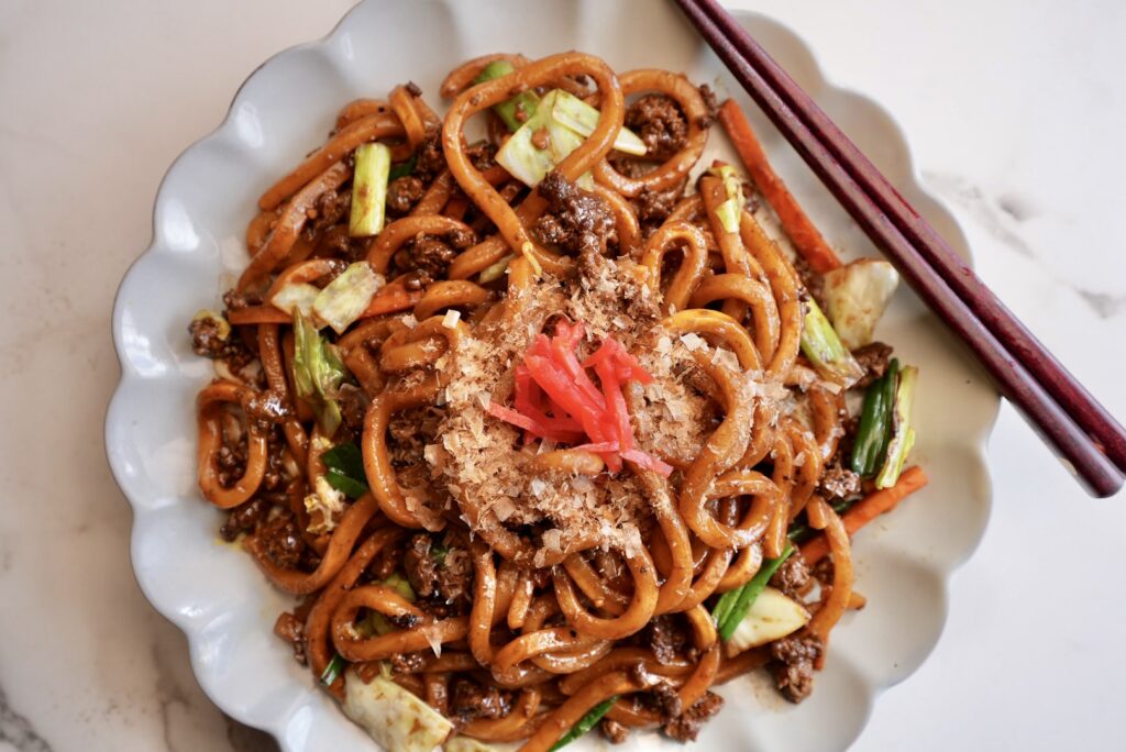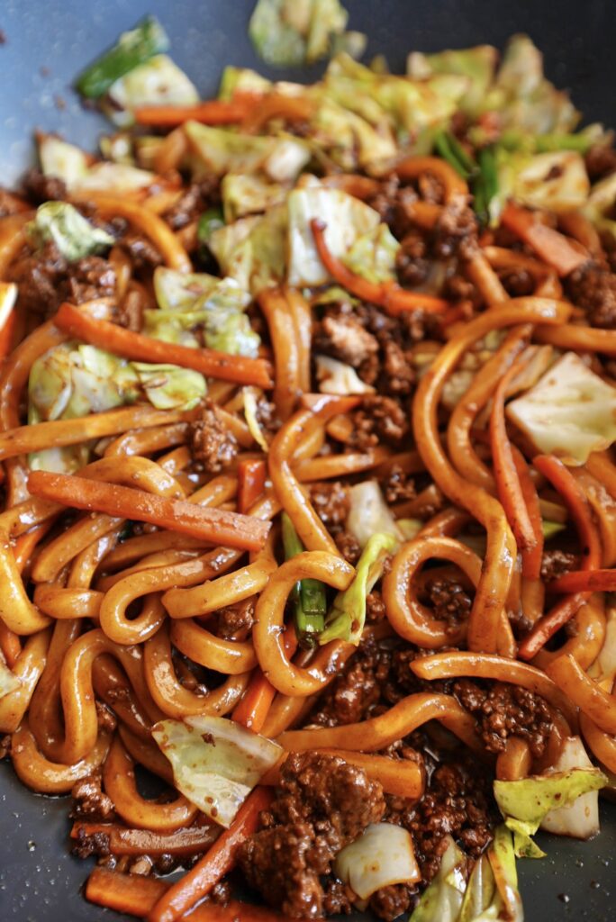 My Yaki Udon is a savory Japanese stir-fried noodle dish made with thick, chewy udon noodles tossed with vegetables, ground beef, and a flavorful soy-based sauce.